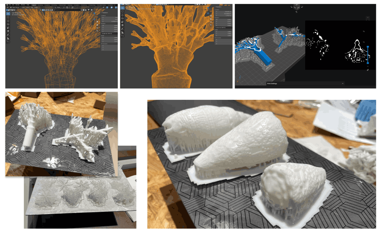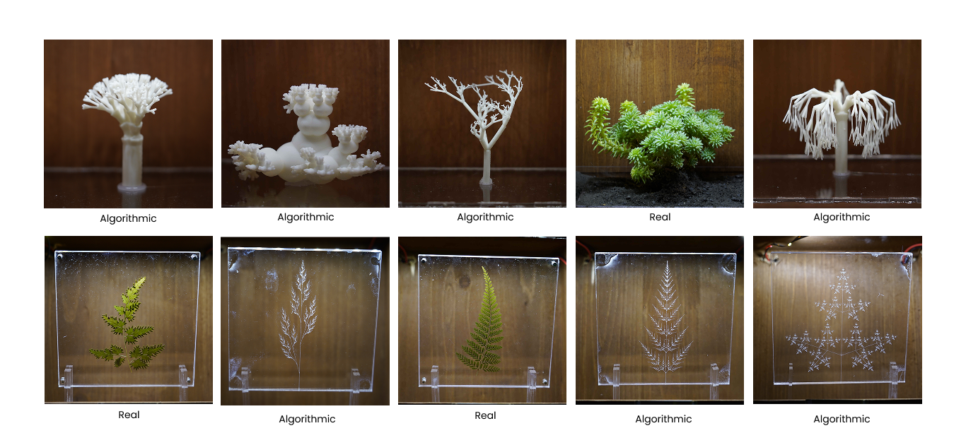I explore nature as a dynamic computational process, using generative algorithms to simulate alternative natural forms that could exist but don't. By materializing these patterns through 3D printing and exhibiting them alongside real specimens, my work invites viewers to imagine the vast, unrealized possibilities hidden within nature's code.