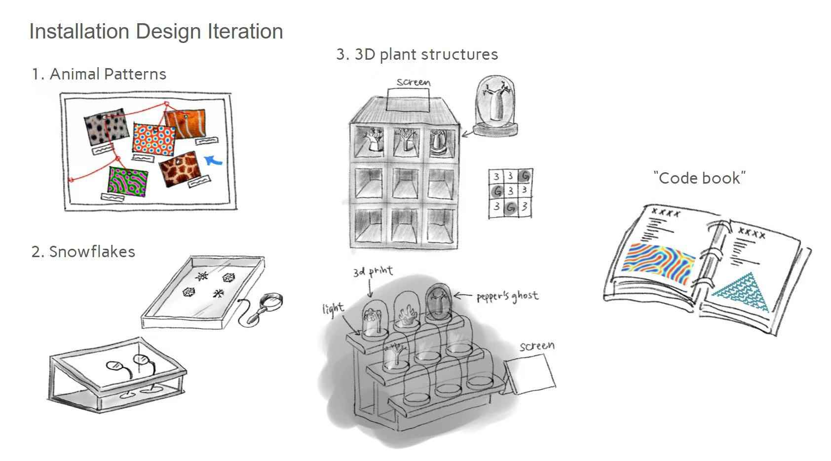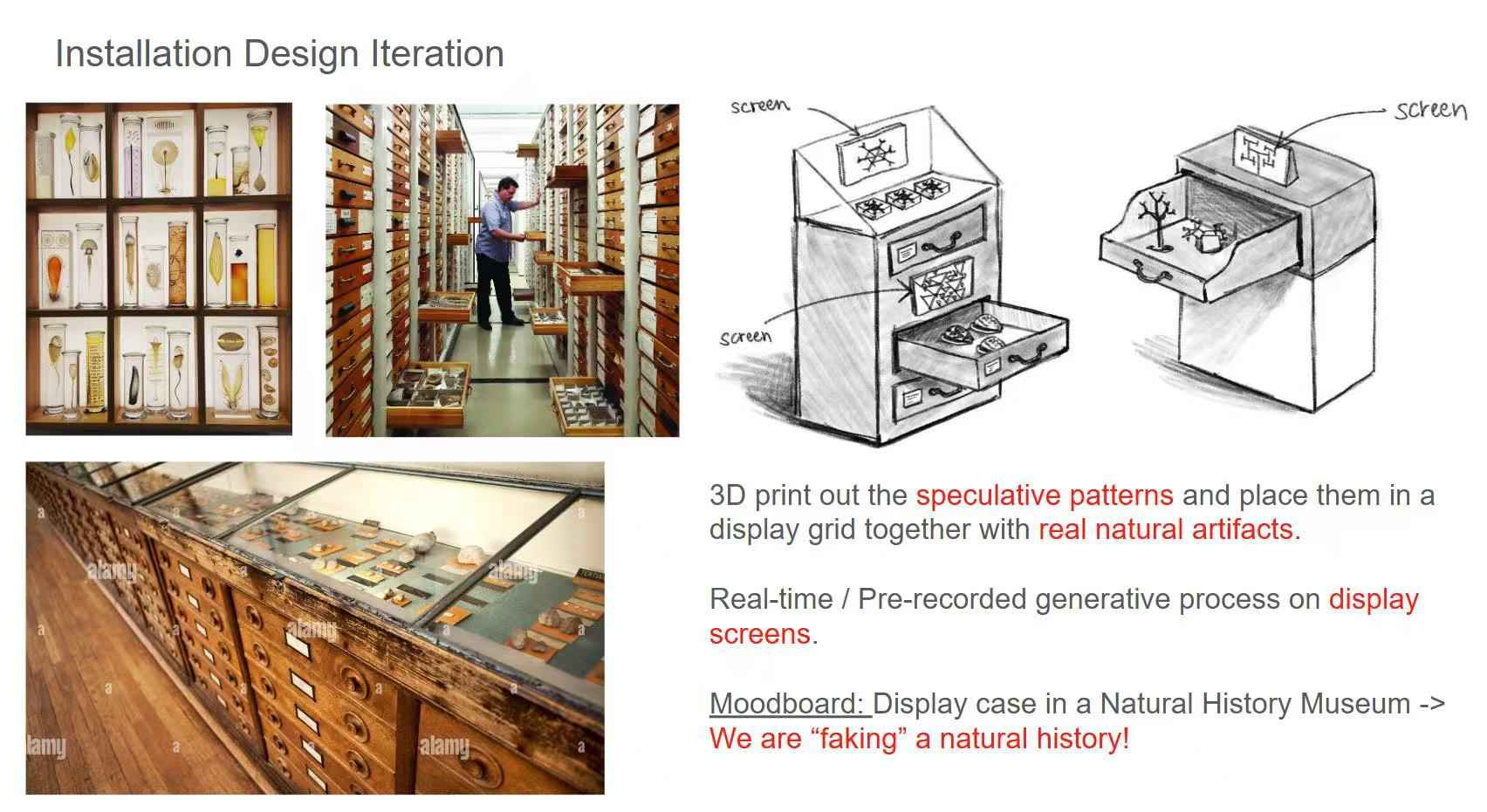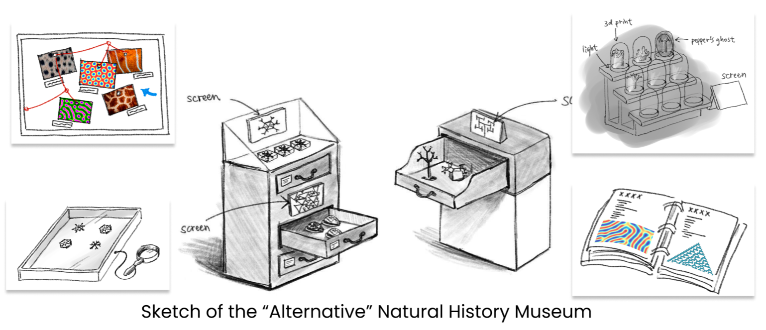 In this project, I generate “alternative” natural patterns that could exist but don’t. By materializing these patterns through 3D printing and exhibiting them alongside real specimens in a natural history museum setting, my work invites viewers to imagine the vast, unrealized possibilities hidden within nature’s code.
