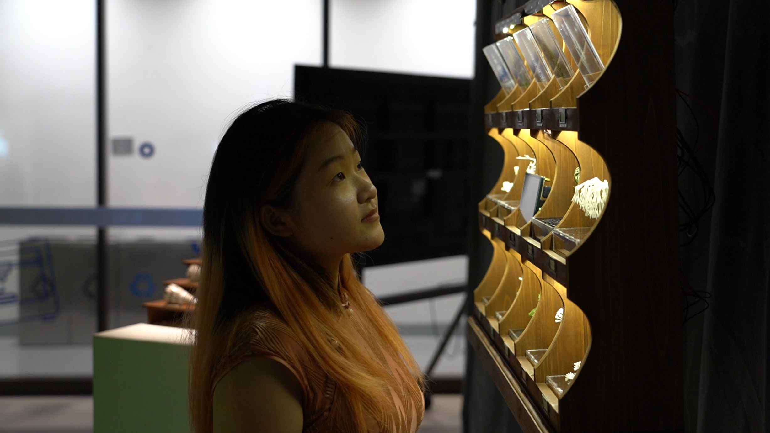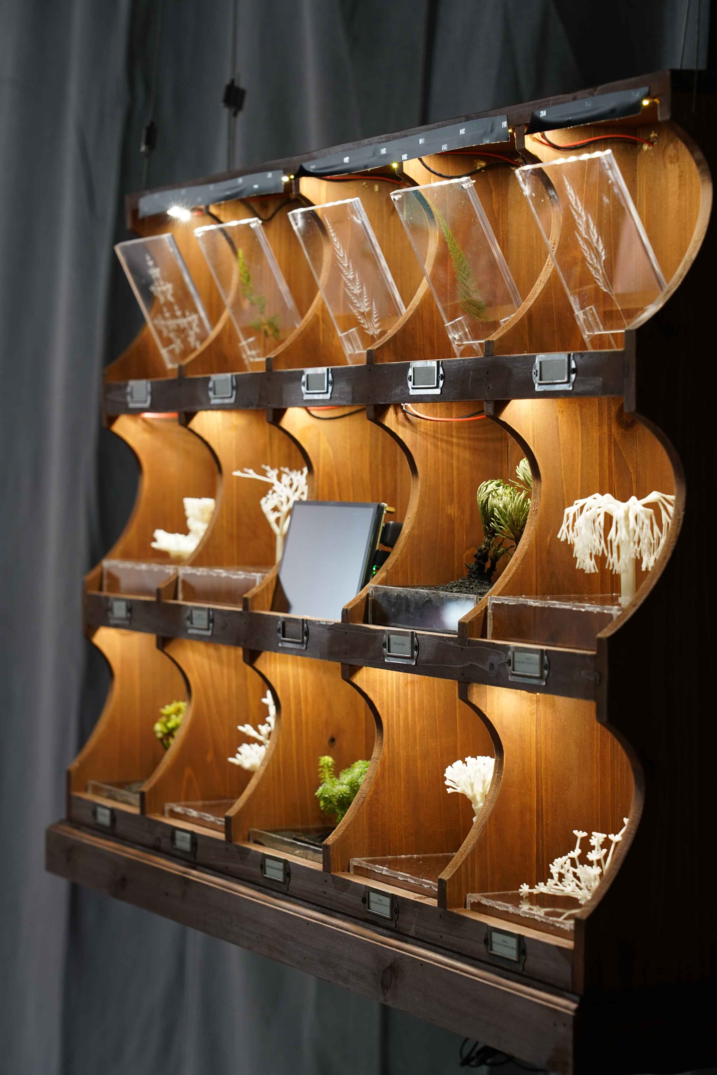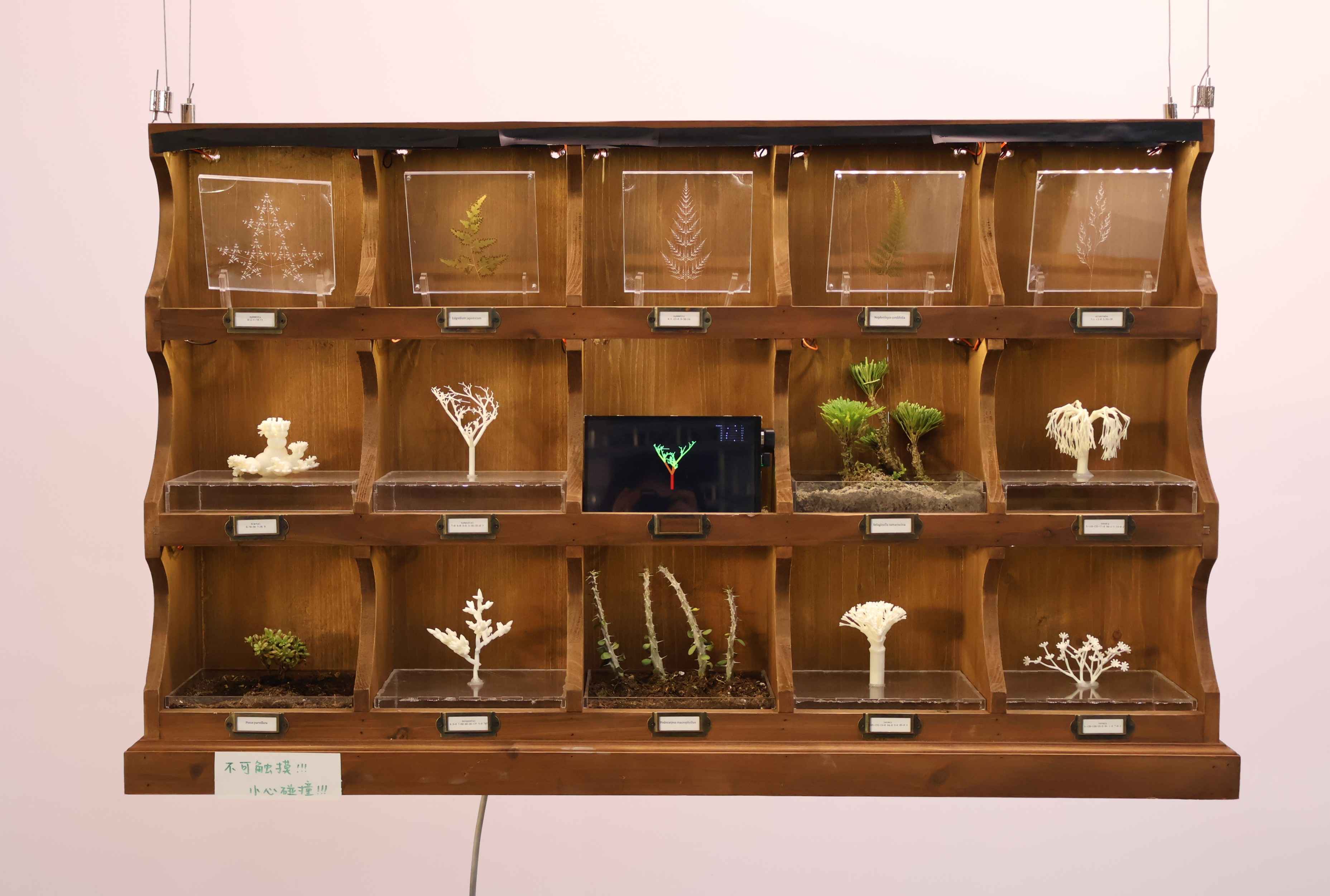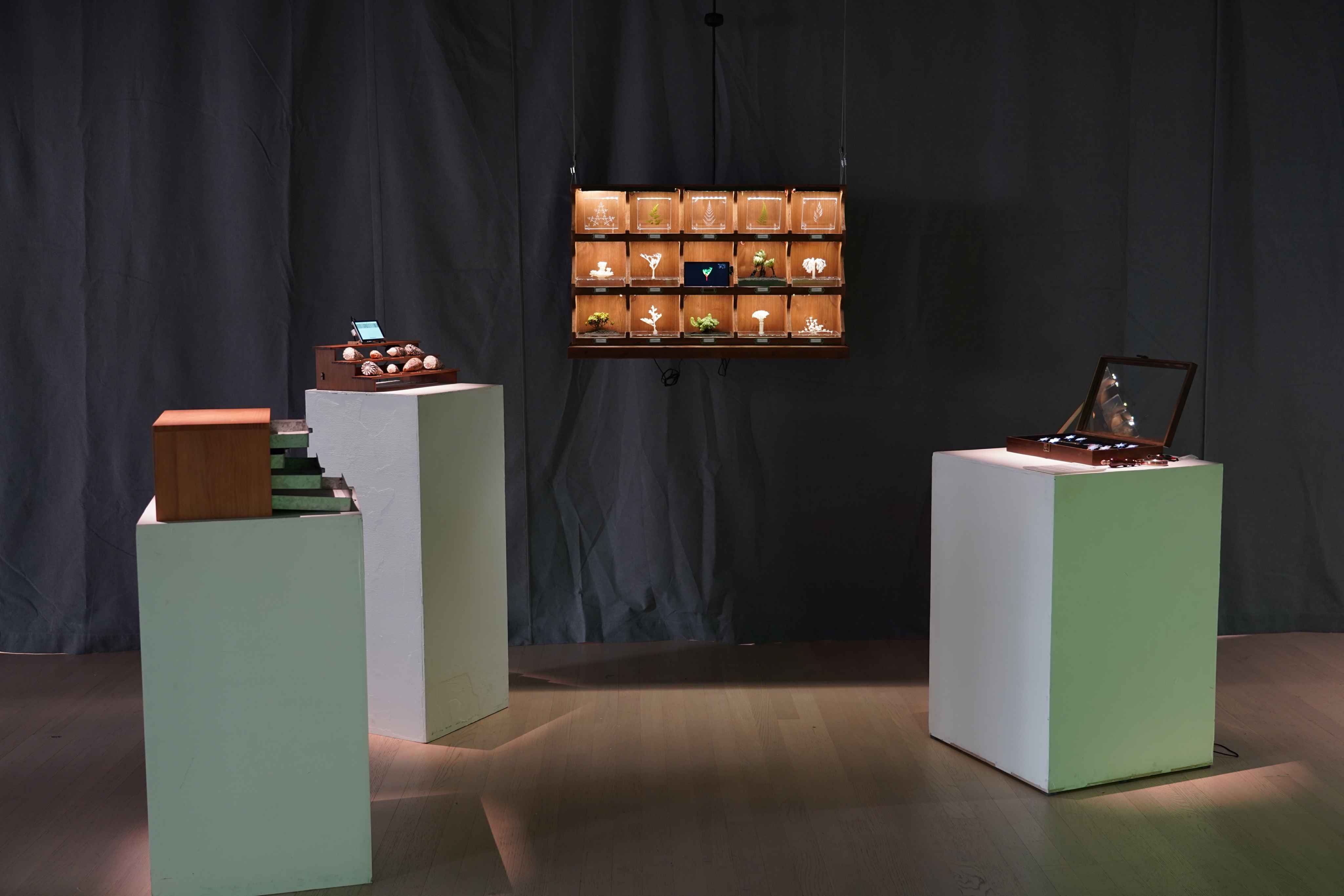 The generative results are materialized through 3D printing and exhibited alongside real specimens in a natural history museum setting.