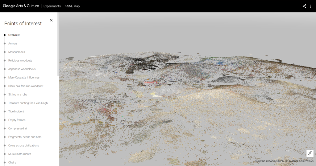The TSNE artwork viewer by Google Arts is another amazing 3d project based on dimension reduction algorithms. This article is an experiment of a similar concept in three.js.