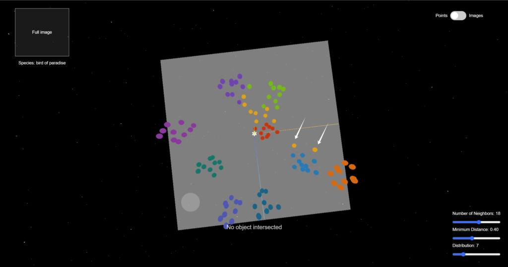 Through using CLIP (Contrastive Language–Image Pre-training) to encode semantic image features and UMAP (Uniform Manifold Approximation and Projection) to reduce high-dimensional data , we unveil the hidden connections within flower images and visualize them in a 3D space with three.js. Explore the space, interact with the data points, and play with the parameters to understand how machine learning classifies sees the data and performs classification tasks.