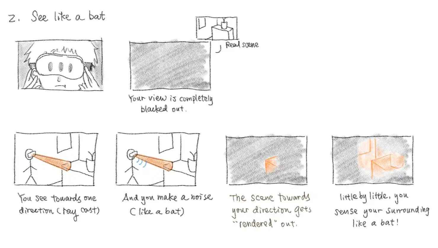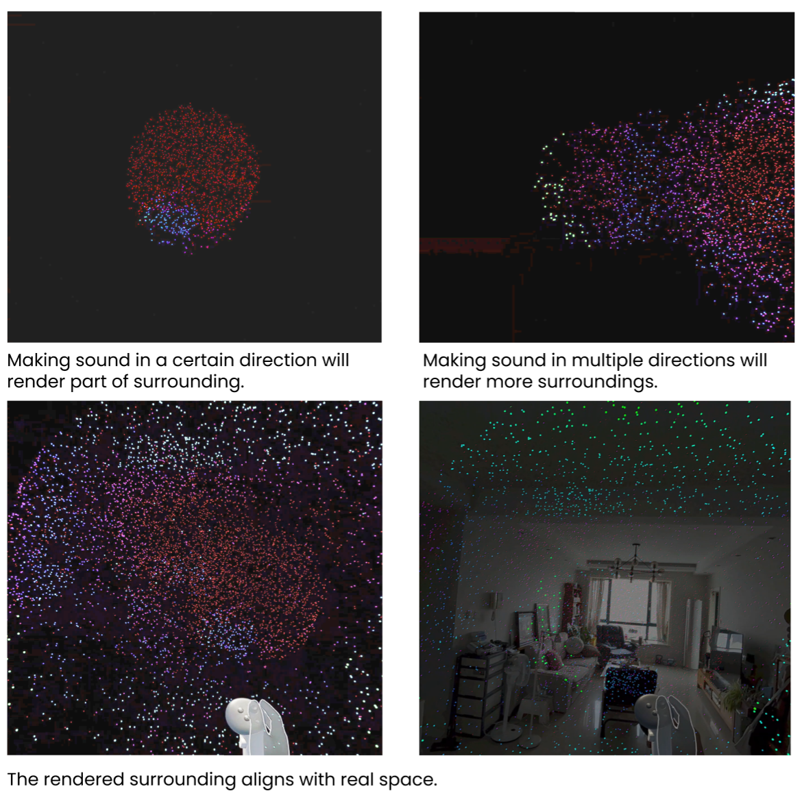 Their vocal input is captured in real time, mapped via ray-casting to simulate echolocation, and rendered as point-cloud that to simulate echolocation, and rendered as point-cloud that reconstructs the surrounding.
