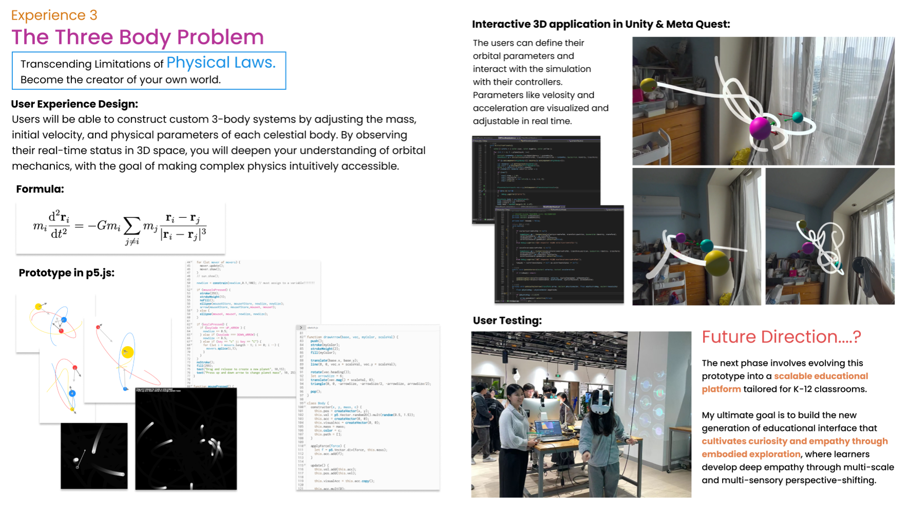 Rather than passively transmitting knowledge from a textbook/slides/lecture in a one-directional way, I want to pass knowledge, or more precisely, the awe or curiosity for knowledge, through interactive experiences. I believe that Extended Reality can offer a special embodied experience. Beyond conveying facts, the project cultivates curiosity and empathy by letting learners embody experiences beyond human physical limits, exploring diverse scale, perception, physical law, and dimensions that humans can't normally reach.