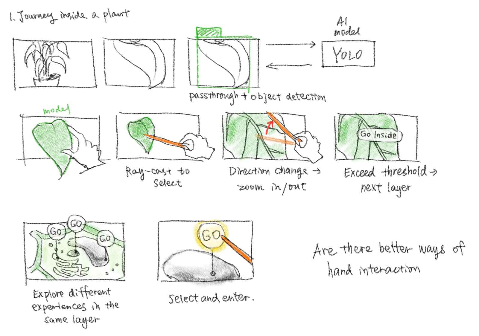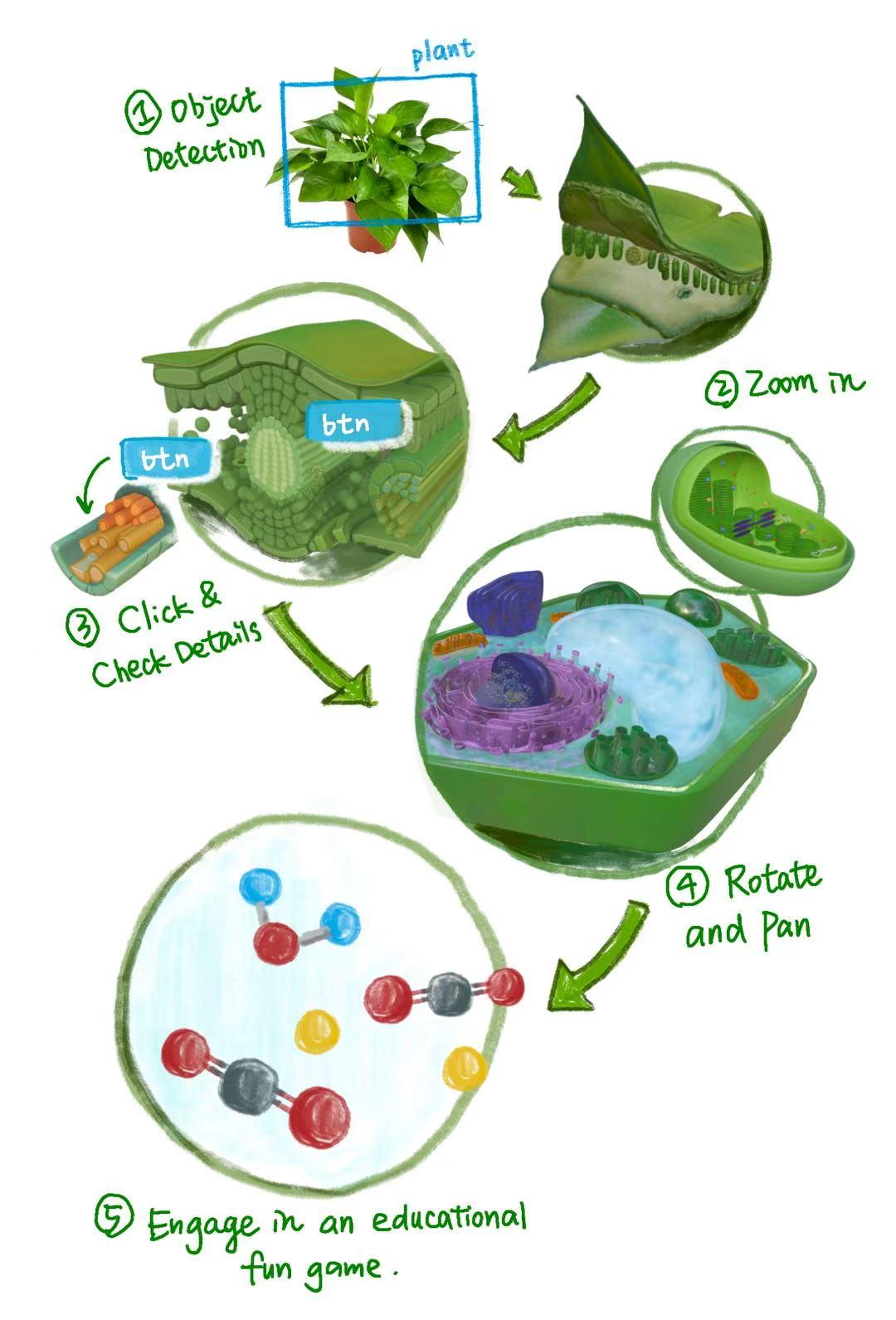 It enables a user stand in front of a real plant, pinch their fingers, and physically “zoom” through layers of biological structure, from leaf, cell, chloroplast, all the way down to molecules. Several interactive mini-games are in the way: For example, users can guide CO₂ and water molecules together to create sugar and oxygen molecules, turning the abstract idea of photosynthesis into something tactile and playful.