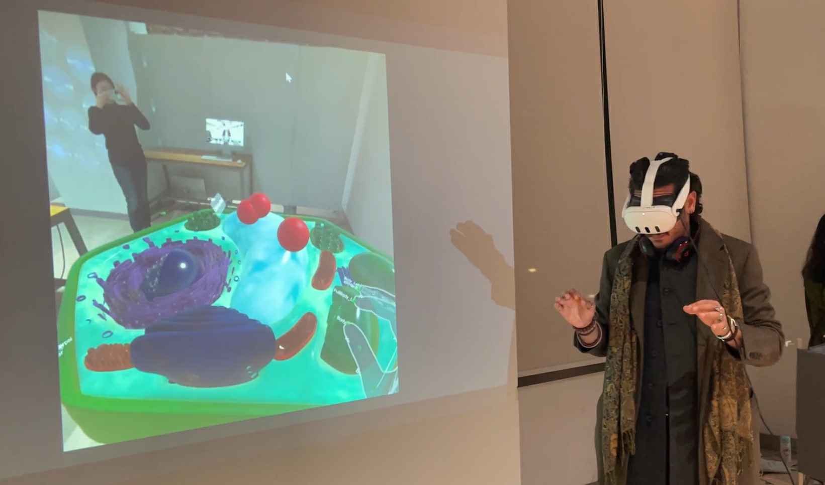 A real plant serves as a portal to smaller dimensions. Through hand gestures, learners can zoom from leaf to cell, even down to the molecular level.